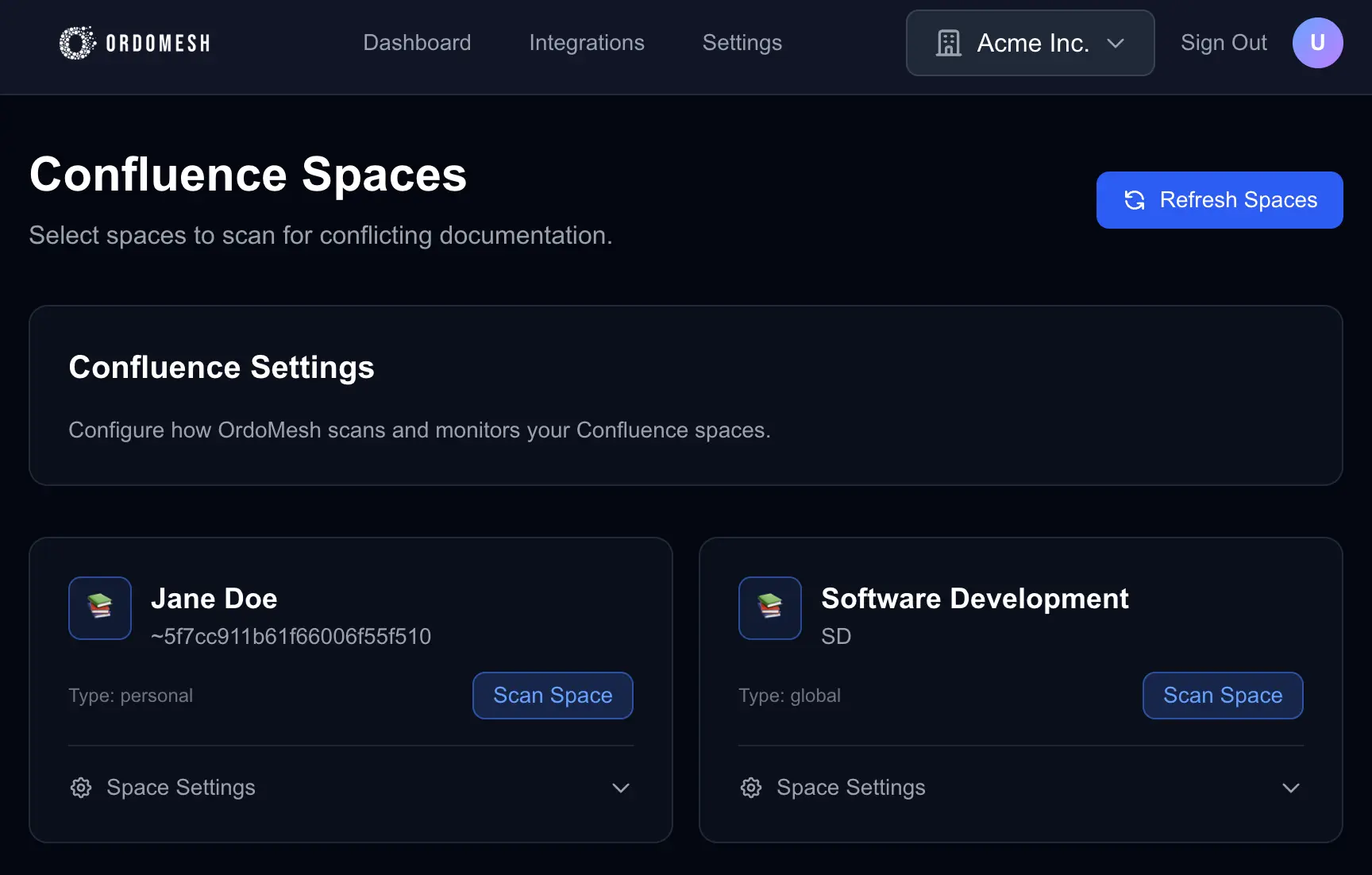 Once connected, OrdoMesh will automatically fetch all Confluence spaces you have access to on the Integration page.
